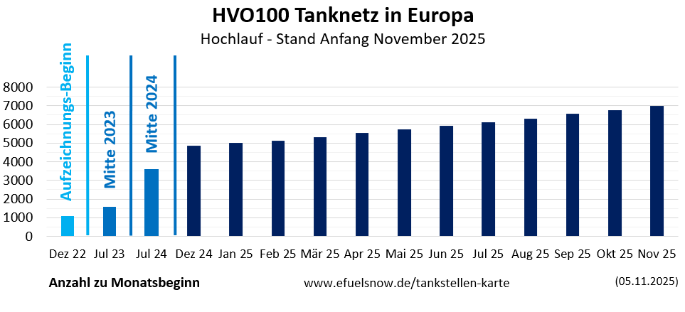 Zwischen Februar 2024 und Februar 2025 hat sich die Anzahl der Stationen mehr als verdoppelt. Aktuell werden monatlich cirka 200 Tankstellen pro Monat eingetragen. Haupttreiber waren bisher Spanien, Italien. Weltweit gehen wir von weit über 20.000 Stationen aus (HVO100 + HVO Blends)