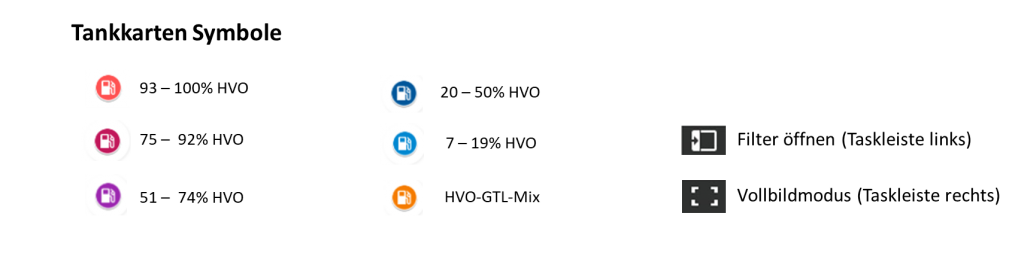 In der Zapfsäulenübersicht wird nochmal in Bildern gezeigt, woran man eine HVO100 Zapfsäule oder eine HVO-Beimischung erkennt. HVO100 hat immer das Etikett XTL. Eine HVO Beimischung kann aber auch „Diesel B7“ heissen. HVO-Beimischungen sind nicht immer von außen erkennbar. Daher unbedingt Icon klicken und Zapfsäulenübersicht lesen!!!