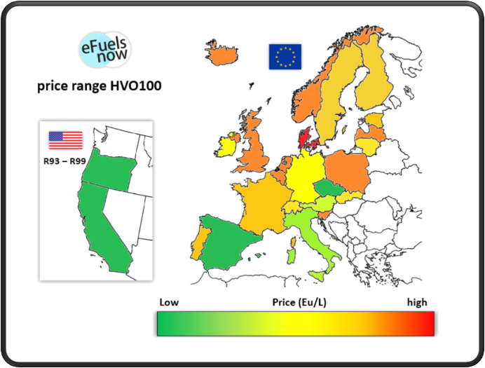 Die Karte ist entstanden, nachdem vielerorts fälschlicherweise behauptet wird, es gäbe generell synthetische Kraftstoffe / reFuels nirgendwo zu kaufen. Sie seien unheimlich teuer und die Reststoffe würden nur irrelevante Mengen ermöglichen. Diese pauschale Aussage ist dezidiert FALSCH ! Mit synthetischen HVO, lässt sich heute schon in einigen Ländern ein erheblicher Anteil des gesamten Dieselmarktes decken. In Ländern, wie z.B. Norwegen besteht ca. 20%-25% des Dieselmarktes aus HVO. Der Standard-Diesel kann dort bis zu 40% HVO beinhalten. In Kalifornien kommt man sogar auf über 50% HVO/BtL für den gesamten Dieselmarkt. Eine Anfrage bei der CARB ergab Stand 2023 sogar 57% (HVO/BtL). Davon macht Biodiesel ca. 7% Anteil aus. Anbei die Grafik mit Splitting (Fig 2). Kalifornien peilt bis zu 100% Abdeckung in 2030 an und befindet sich voll in der Soll-Planung (Link). Nach Greenea werden sich die Produktionszahlen von 2020 bis 2025 ver-4-fachen. Neste ermittelte, dass bei Nutzung sämtlicher Feedstocks bis 2040 1000 Megatonnen (=etwa 40% des weltweiten Verkehrsbedarfs für Auto, Schiff und Flugverkehr) gedeckt werden kann. Das entspricht 100% Schiff + Flugzeug, und 50% des Strassenverkehrs. Quellen: https://www.neste.de und Vortrag von der IAA und Artikel der AutoBild vom August 2023. Entgegen anderslautenden Prophezeiungen, ist also mit einem immer weiter zunehmenden Tankstellennetz zu rechnen. Allein in Italien wurden zwischen März und März 2024 knapp 1000 Zapfpunkte mit HVO100 eröffnet. Der Preis für solche Kraftstoffe bewegt sich bei ca. 1,60 bis 1.90Eu/L (in Deutschland, Österreich und Italien, Stand November 2023). In USA lag er im Januar 2023 bei umgerechnet cirka 1,25Eu/L in Kalifornien und bei 1,03Eu/L in New York. In Italien ist HVO100 teilweise sogar 5-19 cent billiger als fossiler Diesel.