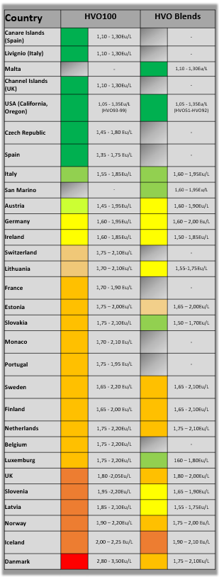 Wie erkenne ich HVO? HVO100 ist meistens relativ einfach zu erkennen. Aber bei den Beimischungen ist das schon schwieriger. Auch ein „Diesel B7“ kann ein hochprozentiger HVO-Blend sein. Bevor Sie regelmäßig HVO Tanken sollten Sie UNBEDINGT dieses Dokument durchgeblättert haben. Vor allem die Seite 2 ist ganz besonders wichtig, da sie die Erkennungsmerkmale nochmal visuell zeigt! Klicken Sie dazu auf das linke Icon. Das Dokument enthält außerdem eine länderspezifischer Übersicht mit Fotos sowie eine tabellarische Angebotsübersicht.
